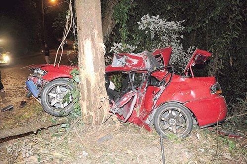 猛烈撞擊下車(chē)身呈形扭曲夾緊樹(shù)干。圖自香港..